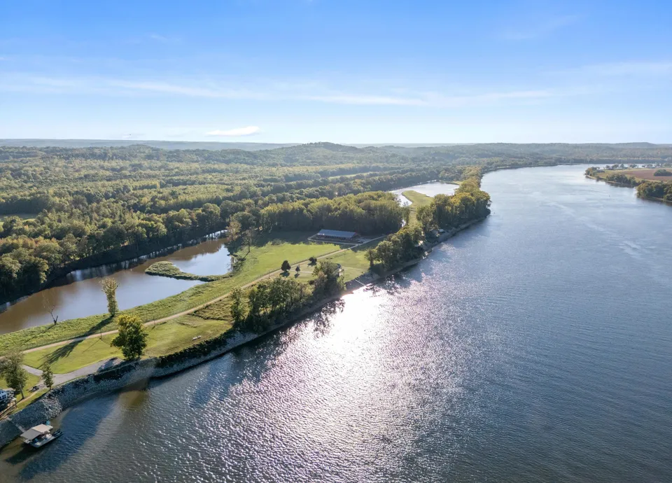 Two inlets from the Tennessee River meander through the bottomland, forming the private lake and flooded cypress slough. Elevated wooded areas offer ideal building sites for a 5+ bedroom estate, compound, or resort overlooking the river. The property also includes two half-acre lots on Scenic Lane as part of the Scenic Lane River housing development, along with a modern tiny home on stilts overlooking the river, inlet, beach area, and soon-to-be-installed private pool. A 148' x 96' pole barn offers ample storage for farm, hunting, or maintenance equipment.