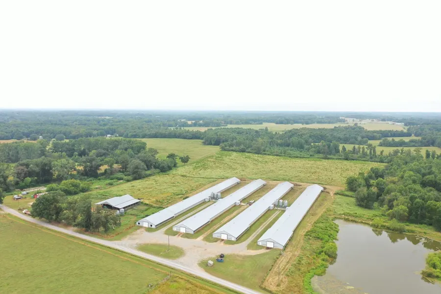 Each poultry house is outfitted with Rotem controllers with digital backups, ChoreTime C2Plus feed lines with turbo pans, brooders, and Lubing drinkers. The interior walls have been spray-foamed for insulation and efficiency. Additional farm infrastructure includes a compost area for mortality, a litt...