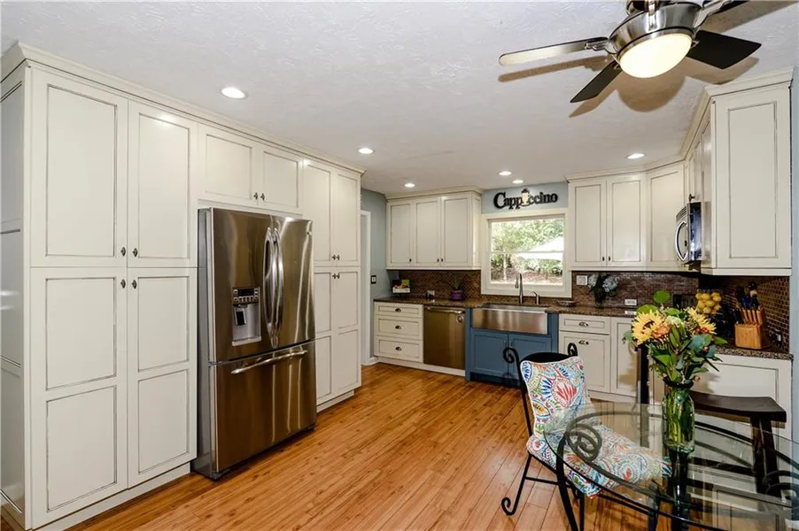 Live in Dunwoody for under $350,000 This pristine split level home offers oversized rooms, new carpet, level front & back yard, 2 car garage w/auto door, Main level welcomes you to the formal living & dining rooms, fabulous eat in kitchen equipped with convection oven, granite counters, tile backsplash, farmhouse sink & ss appliances. The large fireside den/family room adjacent to kitchen has access to private back yard. Bedroom/Playroom/Bonus room, office/library, laundry room & half bath round out the lower level. Upstairs-Owner's suite & 3 addit bedrms & full bath.