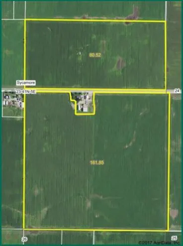 242 acres, m/l, located 1/4 mile east of Sycamore on Lindgren Rd. Farm has 242.38 FSA crop acres with a P.I. of 139.7.