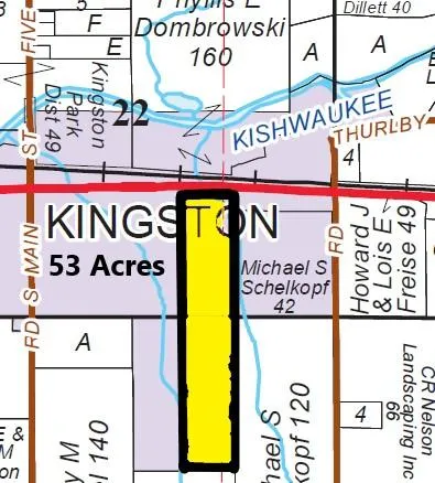 53.78 acre prime investment site. Potential for commercial and future residential use. Partially annexed to the Village of Kingston. Former landscape nursery. Property has 4 buildings: Building #1: 42.5 X 77.5 includes 565 SF office. Building #2: 56 X 90 with insulated 26 X 56 partitioned. Building #3: 36.5 X 45.5insulated shop. Three-unit residential building #4: 20.5 X 103. Public sanitary sewer and public water, also private well. Natural gas. Currently in agriculture with approximately 40 acres of crop land. Productivity index rating of 125.3. Soil type: Octagon, Millbrook, Barony, Drummer, Lisbon, Danabrook. $11,900 per acre. PINs: 02-22-451-021, 02-27-200-002.