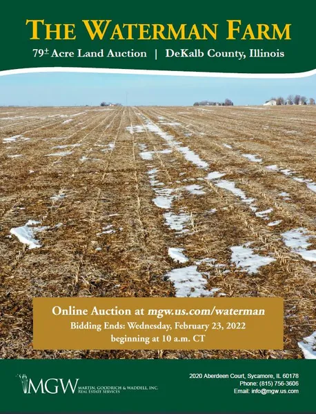 Legal Description: A brief legal description indicates The Waterman Farm is located in Part of the Northeast Quarter of Section 14, Township 38 North - Range 4 East (Clinton Township), DeKalb County, Illinois.