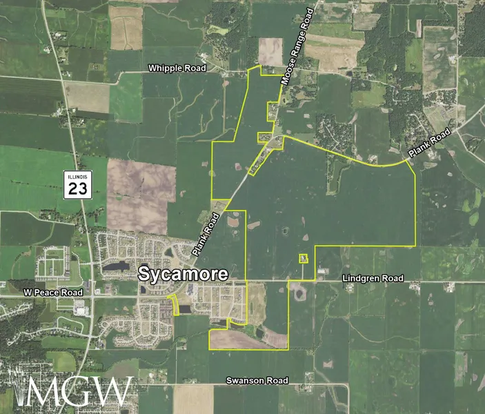 Location: The subject farm is located approximately 37 miles west of Chicago O'Hare International Airport and is located primarily within the city of Sycamore. Nearby cities include: DeKalb (4 1/4 miles southwest), Elgin (11 miles east), and St. Charles (15 miles southeast).