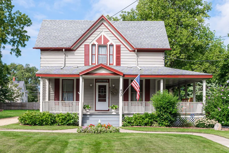 THIS MAY BE THE SYCAMORE HOME YOU'VE BEEN WAITING FOR! You will surely enjoy the huge wrap around front porch on this historic Sycamore home located in a quiet neighborhood close to schools, and downtown. Natural woodwork, hardwood floors, pocket doors, and built-ins add to the charm of this home. Home is currently being used as a single family home, but easily converts to a 2-unit or in-law arrangement. Zoned heating with 2 furnaces, 2 gas and electric meters. First floor foyer, LR w/pocket doors and built in shelving, dining room w/patio doors to the wrap around porch, kitchen that was remodeled 9 years ago, the primary bedroom w/large wall closet, 2nd bedroom currently used as an office, first floor bathroom, and laundry/mud room. The second floor has an open area for a second living room, 2 more bedrooms, a dining room that opens to a small kitchen (could be repurposed as another bedroom), and a second full bath. 2.5 car garage with work bench and cabinets plus a historic carriage house w/loft now used as a storage shed.
