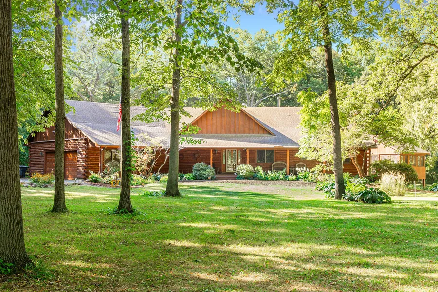 Welcome to your own piece of paradise! Nestled among majestic pines and deciduous trees on 16 wooded acres, which includes a creek, walking trails and gardens, this remarkable home offers a haven of tranquility and natural beauty. Step into the embrace of a beautiful log home that beckons you to unwind and embrace the splendor of nature. This stunning home features over 4,300 sq ft of finished living space. When entering the foyer, you will be awed by the abundance of windows running across the back of the house, overlooking the beautiful scenery. The main floor features an open floor plan with cathedral ceilings, hardwood flooring and stained glass accents. The large living room boasts a stunning stone fireplace, which over looks the dining room with windows on 3 sides. French doors from the dining area lead to the large sunroom. The gourmet kitchen offers custom cabinetry, granite counters, and a 8x8 walk-in pantry. The spacious master suite features a patio door leading to the rear deck, a large walk-in closet with custom built-ins, and a recently updated luxury bathroom with a garden tub, separate tiled shower, heated floors, and a separate closet with a 2nd sink/vanity and commode. A second bedroom and full bath complete the main level. The lower lookout level, includes a spacious family room, with built-ins, 2 generous size bedrooms, a full bath, an extra-large laundry room with sink, and lots of counters and cabinets. The washer, dryer, 2nd refrigerator and freezer stay. There's even enough space for a large craft/project table. The breathtaking back yard features, gardens, a large 22x24 bluestone patio and walkways, a large deck, stone firepit area with a pergola, a 20 x 20 screened building, plus additional decking that wraps around the south side of the house and leads to the charming covered front porch. Additional features include a 24 x 36 Cleary pole barn, a whole house generator, central vacuum, reverse osmosis system, sump pump with backup, an oversized 38 x 38 heated two-car garage with stairs leading to lower level and extra space for a workshop, a garden shed, playhouse, and chicken coop. Updates include 2007 new roof. 2014 Master Bathroom new soaker tub, large tile shower, heated tile floor, vanity, toilet, mirror and lighting. 2021 Replaced decking and railings on south and west side; new windows in dining room. 2022 new windows in sunroom. Please respect owner's privacy, unless you have an approved appointment, PLEASE DO NOT DRIVE IN ON DRIVEWAY. SELLER HAS REQUESTED PROOF OF PRE-QUALIFIATION PRIOR TO ALL SHOWINGS. SHOWING WILL BE CONFIRMED UP RECEIPT OF ABOVE INFORMATION. Please remove shoes. Thank you.