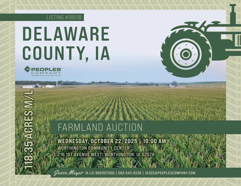 Mark your calendar for Wednesday, October 22nd, 2025, at 10 AM! Peoples Company is pleased to be representing the Klaren's in the sale of their family farm, located just west of Worthington, Iowa, and southwest of Dyersville, Iowa. The farm consists of 118.35 acres m/l and will be offered as two individual tracts. The tracts have great access off 265th Street and 320th Avenue, offering easy access to surrounding grain markets. These nearly 100% tillable tracts have an average CSR2 soil rating of 76, well above the Delaware County average CSR2 soil rating of 65.1. The primary soil types include top-producing Clyde-Floyd complex, Sawmill silty clay loam, Bolan loam, & Dinsdale silt loam. A wetland determination was completed in 2013 that designated the farmland as Prior Converted/Non-Wetland. These tracts are located in Section 27 of North Fork Township, Delaware County, Iowa.