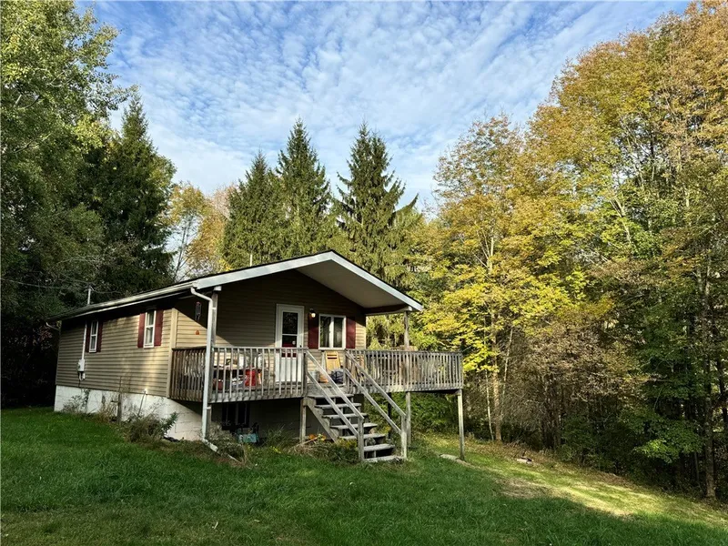 popular destination towns of the area. This adorable 2 bedroom, 2 bath Catskills country cottage offers everything you need to enjoy your very own special slice of heaven. Enter to an open floor plan where living/dining/kitchen flow seamlessly together to create the ideal space for gathering with family and friends. The sliding glass doors offer beautiful views of the woods and give access to the deep wrap around deck where you can enjoy long summer evenings, sunny afternoons and the peaceful sounds of nature. The family room is located at the lower level with walk out access to the yard along with 2 bedrooms, bathroom w. shower, laundry area and ample closet/storgage space. A second bathroom w. shower is located on the upper level. Recent improvements include new hardwood floors, UV Filter, new light fixtures, workshop in the shed and the septic tank was replaced in 2024.