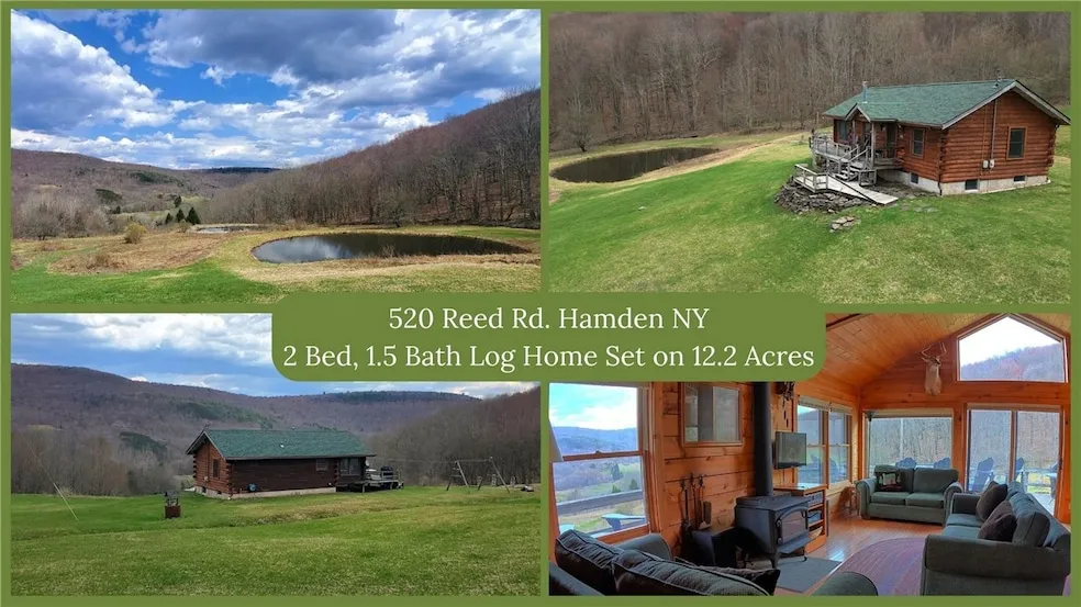This is the quintessential western Catskills Log cabin setup; a superbly maintained 2 bed, 1.5 bath cabin on a full basement with wrap-around deck, complete with breathtaking vistas, a pond, stream, upland woods with trails, spacious lawn areas, storage sheds, and set on a quiet private road this is the one you ve been waiting for. The home itself features an open concept main living and dining area with windows facing out over the easterly viewshed (and sliding doors out to the deck), a central woodstove to provide ample heat (electric baseboard heat exists throughout also), cozy country kitchen, 2 bedroom and a full bath on the main floor. The basement offers additional functional opportunities, with a half-bath, laundry area, and large multi-use space for potential recreation room or additional living space. Exterior aspects include the new asphalt shingle roof, freshly stained siding, expansive wrap-around deck with covered entry, a large shed with power, and additional machine shed. The pond offers a space to relax and enjoy the views, or admire as you pass by and over the charming footbridge, over an upland stream channel and into the wooded hillside, replete with mixed deciduous trees, stone walls, and natural rock features. This really is the whole package and it s located just 20 minutes to Delhi and Walton, 25 minutes to Andes, and only 2.5 hours to metro NY.