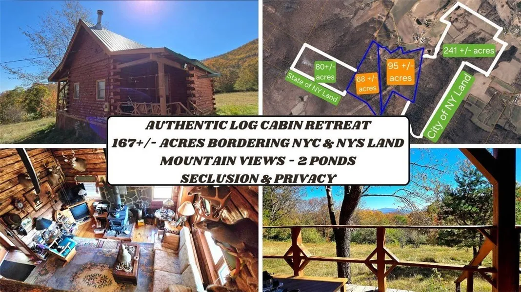 Once-in-a-Lifetime Opportunity - 167+/- Acres with Authentic Log Cabin Bordering 340+ Acres of NYC & NYS Land! Opportunities like this simply don't come along often. This authentic log cabin on approximately 167 acres of pristine Catskill wilderness is a true one-of-a-kind find-a private mountain sanctuary surrounded by nature, seclusion, and endless adventure. Built with craftsmanship rarely seen today, this 1-bedroom, 1-bath cabin features a soaring cathedral ceiling in the great room, a cozy wood stove (plus electric baseboard backup), and a loft that sleeps three and opens to its own balcony overlooking breathtaking mountain views The covered front porch invites you to take in the scenery and the views down to the pond and stretching all the way to Windham Mountain. The crawl space below offers practical storage for ATVs or outdoor gear. The property is nourished by two pure, spring-fed water sources-one from a hillside well and another from a historic spring house beside one of the two tranquil ponds. Apple trees and naturally growing ginseng dot the landscape, adding to the property's charm and self-sustaining potential. A detached garage on a cement pad includes an upper-level room that may possibly be restored for future use. The private drive with lockable gate ensures complete privacy, yet remains accessible by standard vehicle during dry months. Bordering more than 340 acres of NYC and NY State land, this property offers unmatched access to hiking, hunting, and exploring directly from your doorstep. Whether you're seeking a private retreat, a legacy property, or the chance to revive a rare Catskills classic to its original 1985 glory, this is truly a "unicorn" opportunity. A property like this may never come available again-schedule your private showing before it's gone.