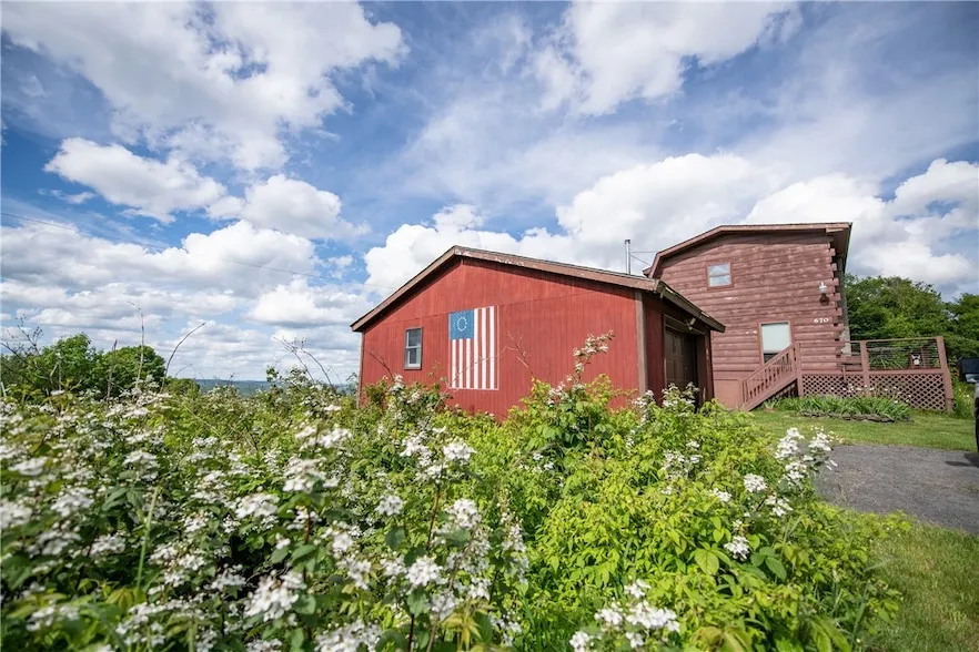 Serene Log Cabin with Breathtaking Valley Views on 10 Private Acres. Step into a picture-perfect escape: this three-bedroom, three-bath log cabin perched above the sweeping river val offers panoramic views, cozy ambience, and effortless access to nature. With rustic timber construction, large picture windows, and an oversized wraparound deck ideal for morning coffee, afternoon lounging, or evening stargazing it s the perfect blend of comfort and wilderness. Inside, you ll find warm wood-tones, and an open living area anchored by a classic wood-burning stove, with modern amenities thoughtfully integrated for ease and charm. The primary suite provides tranquil views from its private balcony, while two additional bedrooms offer plenty of space for family or guests. Outside, the 10-acre lot offers privacy, open lawns, and mature forest, with a detached extra-large one car garage perfect for workshop space, storage, or future conversion. Just minutes from charming mountain village shops, hiking trails, river access, and Catskills farm stands, this property invites you to unwind, breathe deep, and live slow with the ever-changing splendor of nature as your backdrop. If you're looking for a turnkey, rental-ready investment, or maybe for some extra income when you're not enjoying it yourself, this cabin delivers the kind of timeless appeal that makes people stop scrolling. Come see, and imagine the possibilities of making this special escape your own.