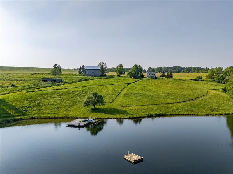 The Lake House... Circa 1905, this cedar-shingle-clad, two-story farmhouse overlooks a 10-acre lake fed by seven natural springs and situated on approximately 275 acres. The residence includes three bedrooms and two bathrooms, featuring open-concept living and dining areas. A sunroom opens onto an oversized deck with elevated views of the lake, two large docks, and the surrounding landscape. A circa 1825 equestrian barn, fully renovated in the mid-1990s, offers eight 12' x 12' stalls and a foaling stall constructed from Southern yellow pine. The barn includes heated tack and wash rooms with hot water and electricity. Adjacent to the barn are 11 acres of three-rail wood-fenced pastures with a run-in shed. The property provides miles of hiking and riding trails leading to over 55 acres of open mountaintop pastures with expansive views. A detached garage is located near the main house, and two additional 10-acre fields are positioned along East Handsome Brook Road. The lake serves as a central focal point and is visible from multiple areas surrounding the home. Located within the Delhi Central School District and minutes from the village of Franklin, which offers boutique shops and dining options, this property combines historic character, extensive acreage, and equestrian amenities in a highly desirable Catskills setting.