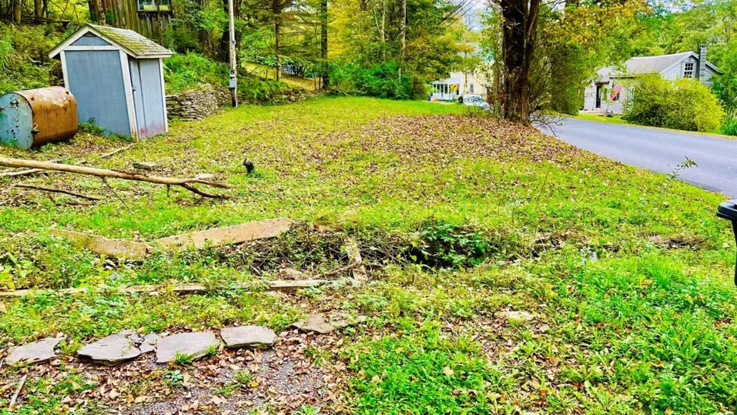 This one acre parcel sits between three properties and still maintains privacy, as the adjoining side properties sit farther away. The back of the property adjoins to an open field. Only one block away from main street Delhi, this parcel also runs parallel to Main Street.This lot has street frontage with a level grass area, and a small shed, and with available village sewer, water, and electric, it has possible building potential.When walking up the slope of the hill, there is a small creek bed flowing down the center of the property to the lower left front portion. There is a very old primitively hand placed rock wall surrounding the whole border, probably dating back to the 1800s. This area is quite beautiful and not too densely populated with trees, and leave open spaces that can be used for recreation and camping. There is a partially shared Driveway entrance with the yellow house next door.