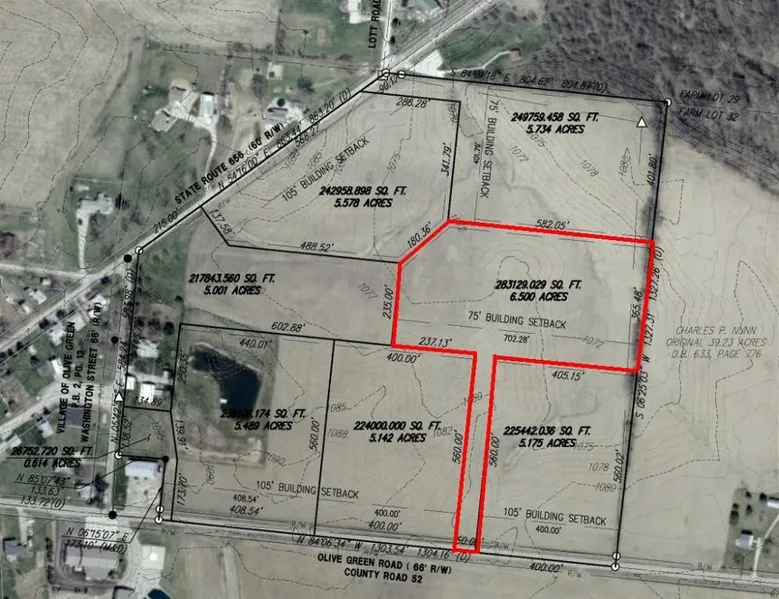 Hard to find building lot in Big Walnut School district, 6.5 acre flag lot provides plenty of privacy and safety off of Olive Green Road. This land is completely open ground with a mature treed fence row on east side of property. Delco water and electric available at the road. Great access to I-71 across Wilson Road. Deed restrictions apply.