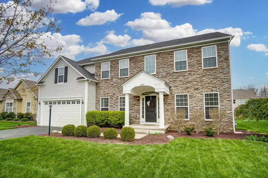 Welcome home to this stunning stone front 2 story in Delaware's Braumiller Woods. The spacious open floor plan boasts 5 bedrooms including a 1st floor guest or mother-in-law suite with a full bath adjacent. The gourmet kitchen overlooks the 2 story great room with an oversized island featuring granite counters, 42'' cabinetry & stainless appliances. Find a 1st floor den & dining off the foyer. Upstairs are 4 bedrooms incl. an owner's suite with sitting area & deluxe bath, a bedroom with an en suite bath plus 2 more bedrooms with a Jack-n-Jill bath! The lower level is partially finished & includes craft/flex room. Use as you see fit! Find a stone paver patio out back to enjoy. Prime location, close to everything but provides a rural setting with lots of open space & community ponds!