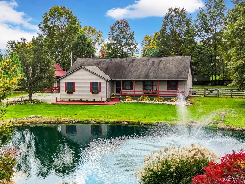 Nestled on 2.5 acres, this meticulously maintained ranch-style home exudes comfort and natural beauty. The open floor plan with vaulted ceilings welcomes you, connecting the living, dining, and kitchen areas seamlessly. Three spacious bedrooms and two full baths offer ample space and privacy. The front yard is highlighted by the front porch overlooking the 10-ft deep, fully stocked pond. The backyard is completely fenced in and features a two-story outbuilding enhances functionality. This charming home, cared for by its original owners, is ready for new owners. Schedule a private showing to experience its unique charm and serenity.