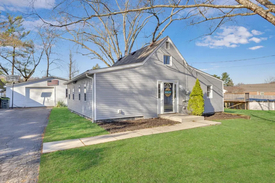Enjoy entry level living on a quiet corner lot, situated at the end of a dead-end street with Big Walnut creek running alongside the property. Soak in the peace and privacy of nature, while also having all the conveniences of the city. This home has been expanded to include a true owner suite, complete with full bath and laundry room. This charming property offers an open floor plan with vaulted ceilings and great natural light. Updated flooring, new kitchen tile, and painted throughout! Outside, the yard is partially fenced and there is an oversized 2-car garage. The additional 240 square foot building has 170 square feet of finished space, electricity, and a mini-split for heat/AC.