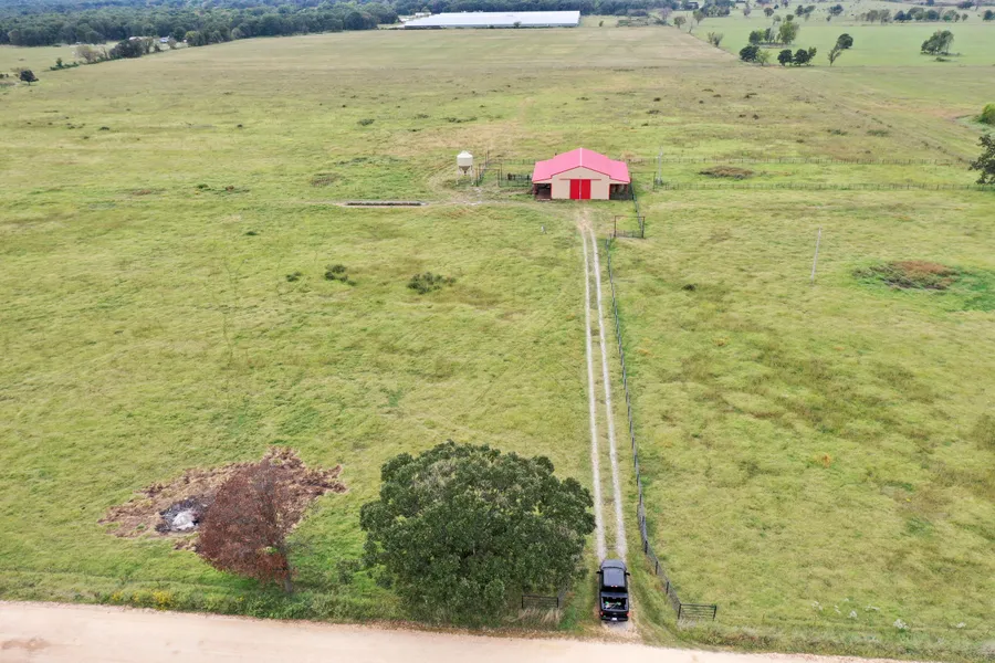 Metal pole barn is 40x60 w/ 16'clearance & 12' lean-to's on each side, double sliding doors on both ends. Contains bathroom, small chicken coop & cement floored area for tack/storage.