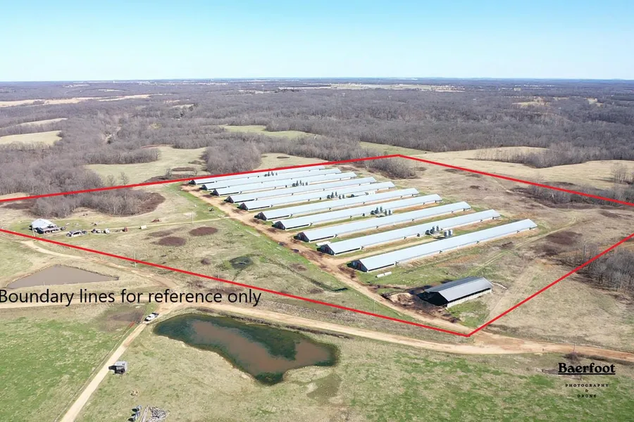 One of workhorse farms that have provided steady income from a solid contract. Simmons contract for small birds (4.5 pound target) at 35 days produces about $500,000 annually in these 2004 built 43x500s with drop ceilings and wood trusses. 40 acres MOL, 3/2 home, one stacking shed. Houses will need updates. We are getting bids at this time. Updates will result in a pay raise that should set the farm making almost $600,000 some years.