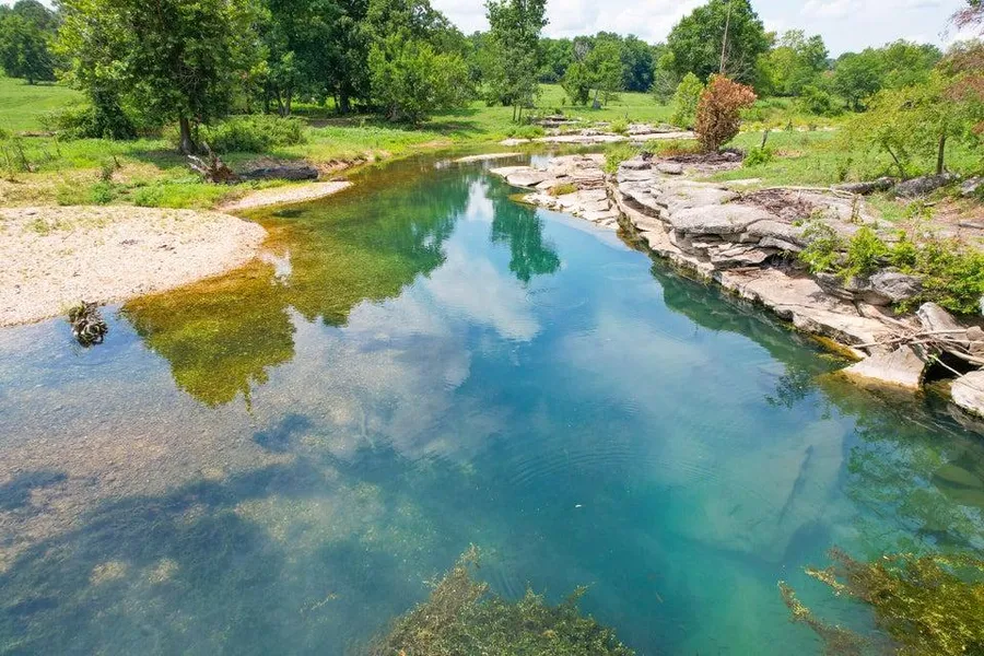 With +-160 acres, the Kelly Ranch boasts an estimated 1,800 feet of Grand Lake water frontage along with about a mile of the crystal-clear Drowning Creek. The creek splits the property, inviting anglers to fly fish, kayak, and revel in the tranquility of nature. There is a couple of deep swimming holes, a cave and hiking trails along the creek. Included with the property are two full brick ranch-style homes, large metal building, a barn, and another potential home.