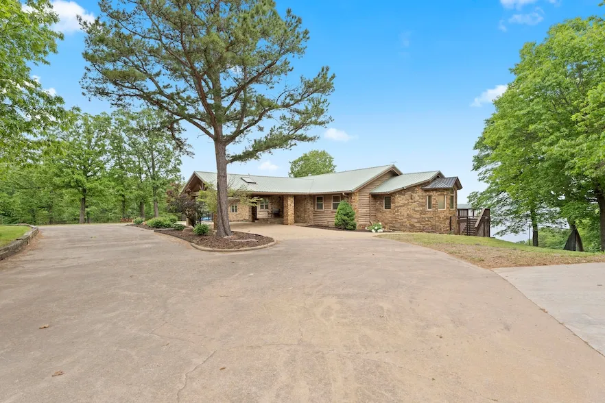 Discover the perfect blend of rustic charm and modern luxury in this stunning log and stacked rock home perched on the serene shores of Grand Lake. With a million-dollar panoramic view, this one-of-a-kind lakefront property offers timeless craftsmanship and every amenity you need for both full-time living and weekend getaways. Step inside to soaring vaulted ceilings adorned with exposed wood beams, a stone fireplace, and a wood and stone floor that anchors the open-concept living area. The kitchen and dining room flow seamlessly, featuring granite countertops, stainless steel appliances and ample space for entertaining. Retreat to the spacious master bedroom, where you'll find a luxuriously appointed ensuite with stained exposed wood ceilings, a large walk-in shower, soaking tub.