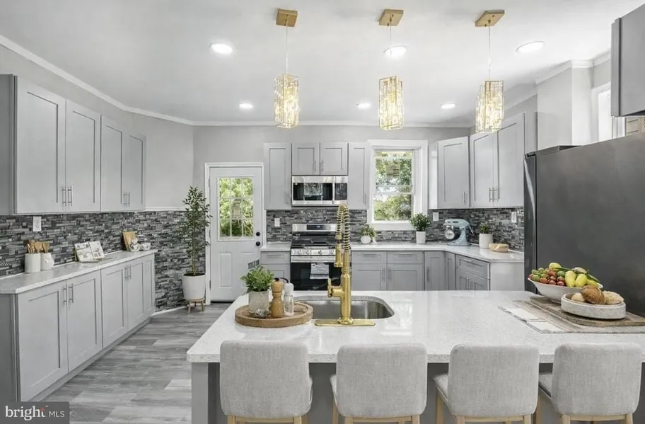 Welcome to 307 Poplar Street, where timeless elegance meets modern living. This fully renovated, move-in ready twin home has been thoughtfully reimagined with attention to every detail, offering a perfect combination of luxury finishes, smart technology, and functional design. Nestled on a quiet, tree-lined block, this 2-story gem boasts central air, a brand-new HVAC condenser, all-new electrical wiring, new vinyl siding, and a polished porcelain-tiled front porch that sets a stunning first impression. Main Level & Designed for Elegant Living. Step inside to a dramatic open-concept first floor, where rich textures and modern flair create an unforgettable atmosphere. The living room impresses with a floor-to-ceiling tiled accent wall, a stylish electric fireplace, and a grand chandelier that defines the space with warmth and sophistication. The flow continues seamlessly into the dining area and a chef-inspired kitchen featuring: Soft-close cabinetry and drawers. Samsung stainless steel appliances, including: Wi-Fi&enabled smart gas range with convection oven and built-in air fryer. French door refrigerator. Mounted microwave with exhaust fan. Sleek dishwasher. Brushed gold faucet and finishes for a bold designer touch. Just off the kitchen, step out to your private rear deck, overlooking a generously sized backyard ideal for hosting, gardening, or simply enjoying the outdoors. Lower Level & Versatile Finished Basement. The fully finished basement offers a versatile extension of living space with a half bathroom, Samsung washer & dryer, new furnace, and new hot water heater. It's the perfect setting for a home office, guest suite, gym, or media room. Upper Level & Restful Bedrooms & Spa-Like Bath. Upstairs, discover three generously sized bedrooms, each featuring ceiling fans, ample light, and comfort. The beautifully updated full bathroom evokes spa serenity with floor-to-ceiling designer tile and a unique faux stained-glass window that fills the space with charm and natural light.