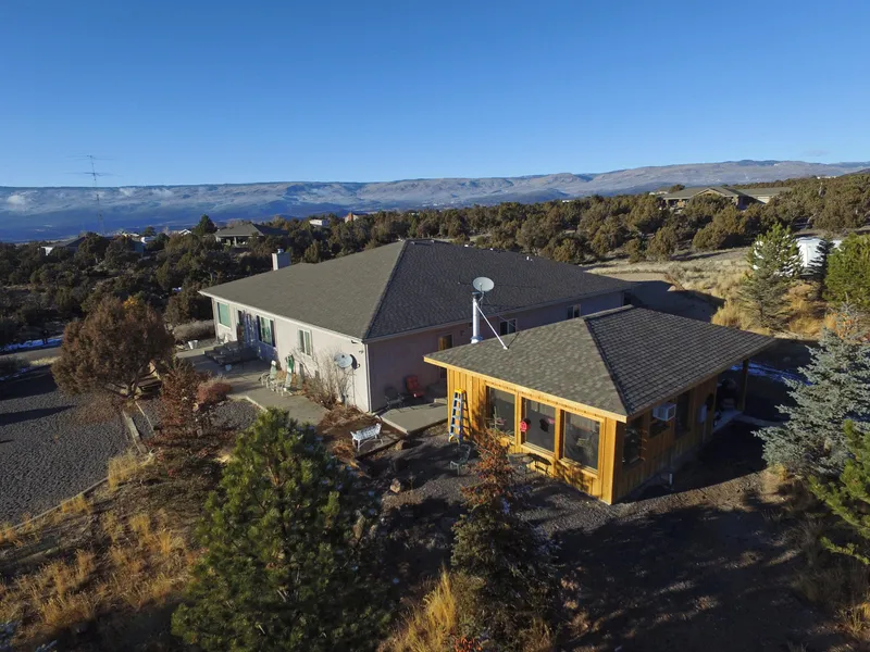 This Colorado mountain home for sale is located just 1.5 miles east of Cedaredge, Colorado, situated on 3.81 acres of a mesa overlooking the Gunnison Gorge and the Surface Creek Valley. Built in 1999, the home is all on one level, with expansive decks, 4 bedrooms, 2 baths, and 2,982 square feet of heated space. The attached 3-car garage has oversized bays for full-sized pickups. The home features a gorgeous river rock fireplace with stove insert to heat the home, a large kitchen, faux plaster paint for a warm southwestern feel, and a big bonus itema 20x20 outdoor kitchen BBQ shack with gas range, sink, fridge, expansive countertops, and a small wood stove for cold winter days. The cook shack is fully insulated and could easily be converted into an artists studio, wood shop, or other hobby room. There is also ample room for RV parking on this parcel, which has drip irrigation to grow the spruce and ponderosa trees, and a xeriscape yard for low maintenance. Deer are frequent visitors to the property.