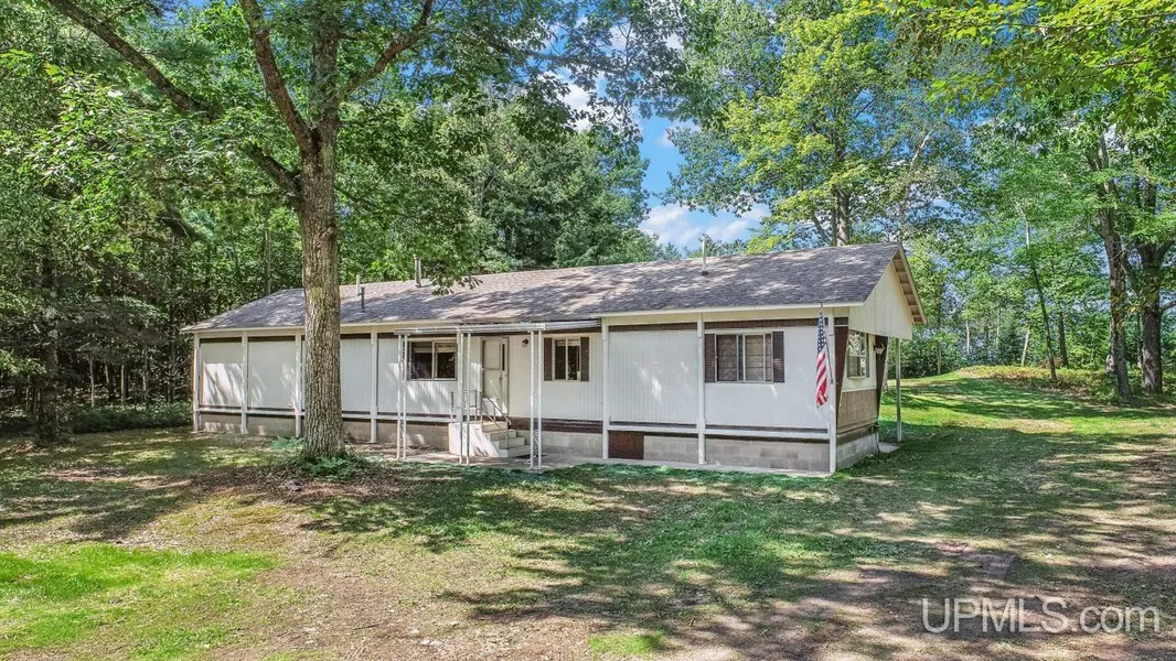 Private setting with 150ft of lake frontage on Big Bay de Noc! Stairs ascending to the water are new as well as newly planted grass. The mobile home has primarily been a seasonal home for previous owners and is in great condition. There is a 24' wide truss roof system over the top of the mobile home, the sun porch and patio. This is a great place for a seasonal but could be a year around home or future building site for a new home and outbuildings. Enjoy all the seasons the UP has to offer at this private retreat location!