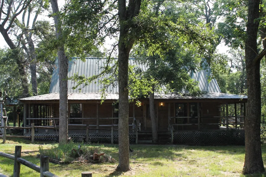 Rustic 2 story log home surrounded by oak trees on a secluded 147 acre tract. Home includes big open living area, wrap around porch all the way around the house, & an oversized garage. Property is fenced with a mix of mature trees and pasture, two stock tanks and an old dairy barn. Deer, hogs and other wildlife in the area. Would make a great week-end retreat or hunting lodge.