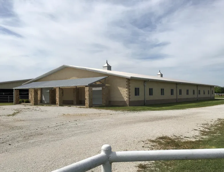 TRACT 1: 9.7 Acres features a Custom Insulated Show Barn, 27 stalls with automatic waterers, large office/reception area with wet bar, oversized tack room, wash racks, tankless water heater, stock and kitchen/laundry room. Also an 80' x 175' covered arena with wind screens, large equipment building with ranchhand living quarters and extra storage, 6 horse walker, tie stalls, turnouts with loafing sheds and all pipe fencing. Road Frontage on FM 2931.