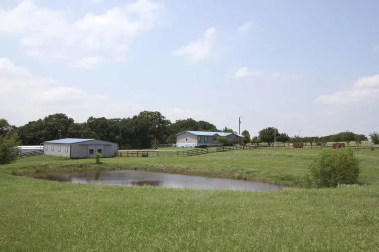 The horse facilities include a 36x48 5-stall barn, a 2-stall barn with loafing shed off the back and another 2-stall loafing shed. The 5-stall barn has a concrete center aisle, 4-12x12 stalls, 1-12x16 stall, a large tack room, feed room and a covered extension with a set of stocks and an outside wash rack. There is a lighted outdoor arena, a couple of fenced pastures, a stock pond and plenty of room to add a custom home towards the back.