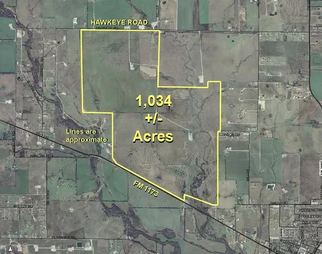1,034+/- acres on FM 1173, frontage on FM 1173 at the south border and Hawkeye Road at the north border. 1 mile west of Krum. Good topography, fenced and cross-fenced, very little flood plain, power line, some oil production. Great ranch for future development. Buyer to verify all information.