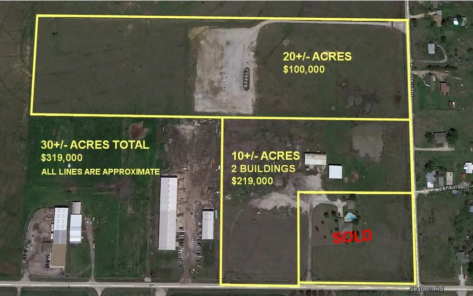 GREAT POTENTIAL! Perfect for your home or business. 30 + or - acres, 50x100 workshop, 60x60 workshop, pipe fencing, road frontage on Seaborn and Robinson Rd. Easy access to I-35. Property can be subdivided. Buyer to verify all information.