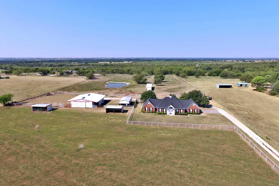 Located between Denton and Aubrey, this well-maintained 10-acre property features a striking custom home on acreage set up for horses.