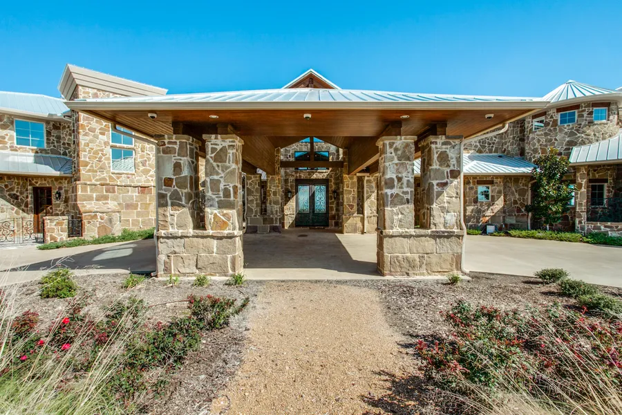 This home with a rock/stone exterior has a metal roof with gutters that tie back to the underground French drain system. The exterior of the main house is professionally landscaped with inground water sprinklers for the lawn, trees and flower beds. A large circular concrete driveway with a landscaped garden and full-size bronze horse statue in the middle, greet guests as they approach the main house. An attached four car garage and large porte-cochere provide ample covered parking.
