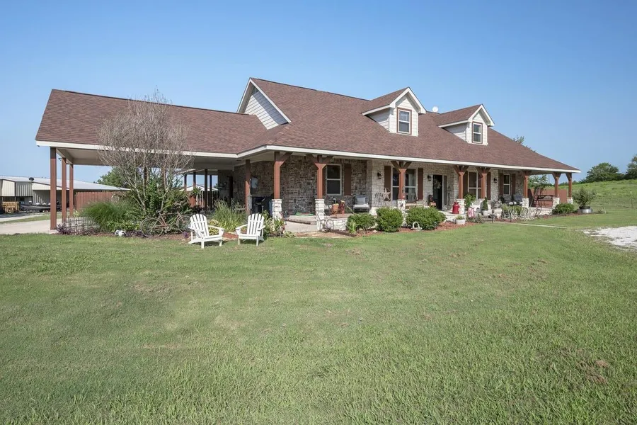 Country charm at its best! Less than 10 minutes from I-35 and Sanger, home sits on rolling 12 acres (plus or minus) that boasts beautiful sunrises and sunsets. Spacious two story home features over 3,800 sq ft with open floor plan, wood burning fireplace, alder wood cabinets, five bedrooms (master downstairs), three full baths, office-bedroom and additional game or media room upstairs. Property includes large mature trees, fenced and cross fenced pastures, pond, 47 x 35 workshop with 1 bedroom, 1 bath living quarters, two 12 foot roll up doors, 4 stalls, and tack room.