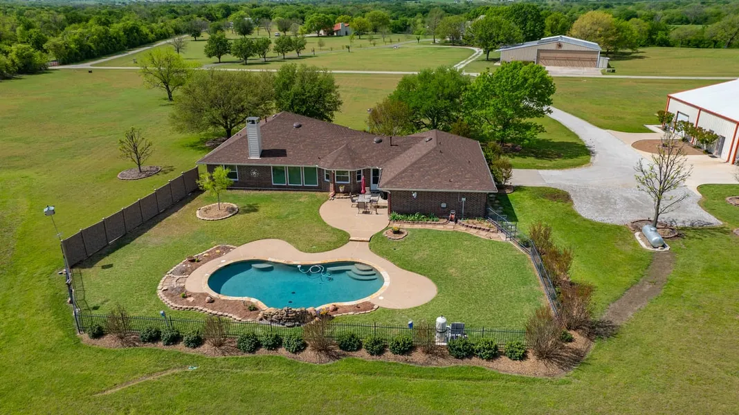 Welcome to Bar VK Air Ranch Estates, a quaint community for aviation enthusiasts. This immaculate property is within viewing distance of the runway and a short hike to the lake. Situated on 4 acres is a 2000sqf home with attached garage, pool and 50x48 hangar with attached workshop and RV storage. The house is surrounded by established shade trees and landscaped with Texas hardy plants. Inside, you find updated kitchen and bathrooms, with 4 bedrooms, one of which includes a Murphy bed and doubles as a second office. The main hangar door is a 12x42, electric, cable driven, bifold, and the RV storage features 50Amp, 30amp and septic drain. There are many more features and updates listed download. When the neighbors are not in their planes, they are frequently on their golf carts visiting, fishing the lake and enjoying the views. Information deemed reliable but to be verified by Buyer and Buyer's agent.
