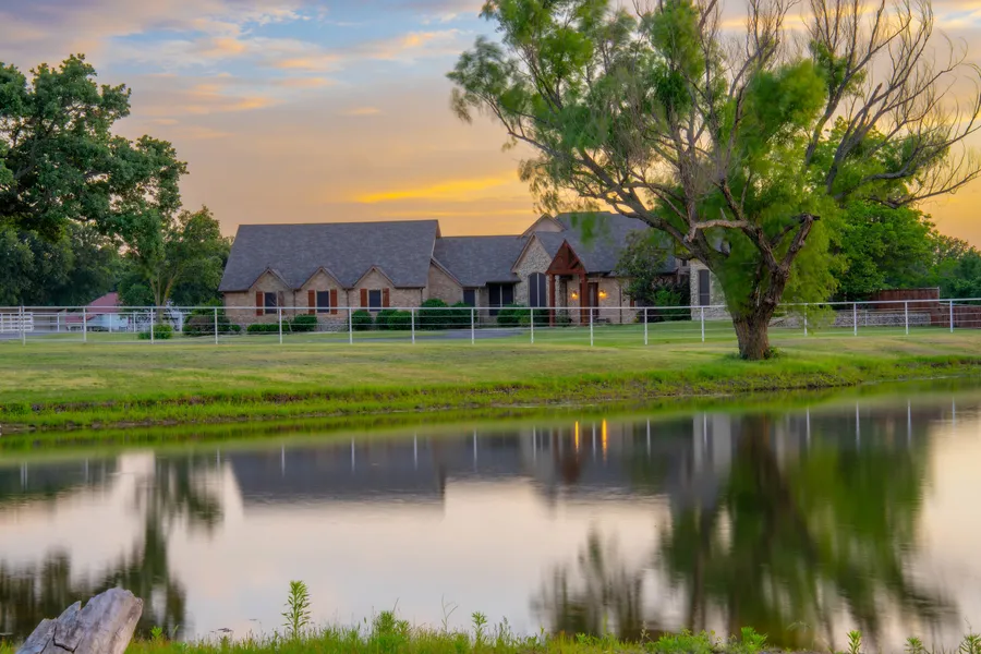 Located in the heart of North Texas' horse country, this 4,487 sf residence blends classic design with modern updates. The split-bedroom floor plan offers both privacy and functionality, with the primary suite and private office on one wing and additional bedrooms and living spaces on the other. Recent upgrades include engineered hardwood flooring, exterior privacy screens for energy efficiency, and updated pool and equipment. At the center of the home, the kitchen shines with quartz countertops, custom tile work, double ovens, and a Samsung refrigerator. Surrounding spaces include a formal dining room, living room with wood-burning fireplace, coffee bar, breakfast nook, and second living area. Upstairs, a private suite offers a wet bar, bathroom, and oversized walk-in closet. A Jack-and-Jill bedroom and second office complete the interior. The spa-inspired primary bath features a freestanding soaking tub and walk-in shower. Outdoors, a sparkling pool with dedicated bathroom provides summer relaxation, while a 1.85-acre private lake with fountain and dock offers fishing, sunsets, and gatherings. Equestrian amenities include white pipe-and-cable fencing, a 5000sf barn with 12 stalls, a 25’ x 15’ apartment, a 12’ x 14’ wash bay with tankless hot water, tack room & office, and 67’ x 15’ overhang for equipment and hay storage. Automatic waterers, fans, timers, outlets, and LED barn lighting add convenience and efficiency. A Trojan walker, 140’ x 140’ open arena with improved substrate, and 6.85 acres coastal pasture (appx yield 8,200–11,300 lbs. per acre) complete the setup. Over 80% of the property currently holds an agricultural exemption. From modern upgrades to equestrian facilities, this property delivers the best of Texas ranch living.