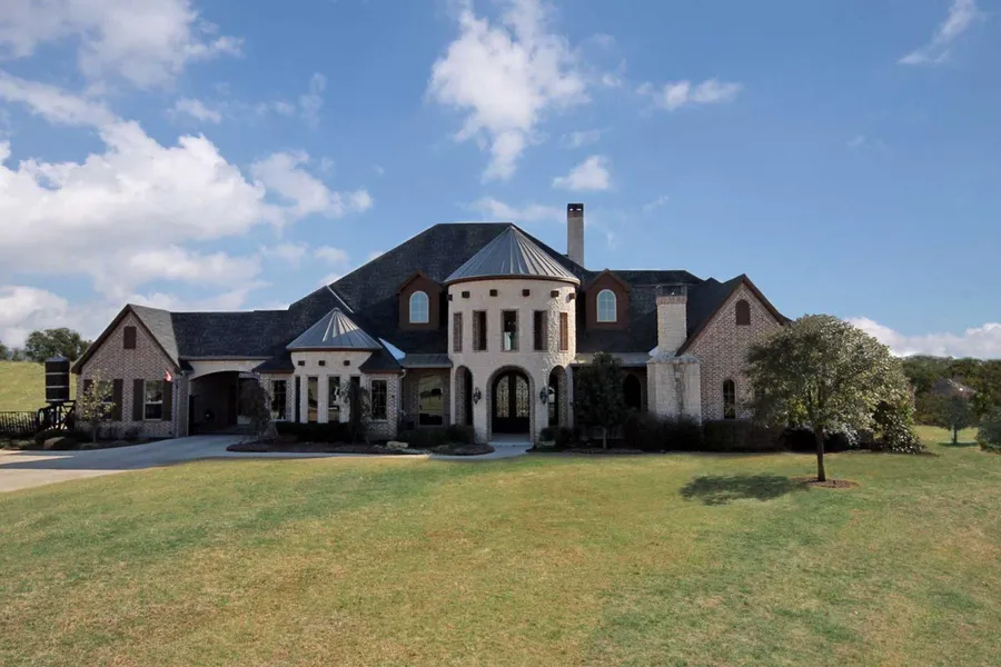 Built in 2008 for the current owner, the homes brick and stone two story design provides over 6,000 square feet of interior living space with spacious rooms and many special features throughout. The focal point of the layout is a large family room with wood beams and a 24-ft tall stone wood-burning fireplace that can be shared by many areas of the home. There are 4 bedrooms, 4 full baths, a private home office, 2 dining areas and a great kitchen with gas cook-top, double ovens, ice maker and plenty of prep and storage space. Overlooking the family room is a huge upstairs game-room with wet bar, built in microwave, two flat screen TVs and a turn-key media room. The home design is enhanced by lots of wood and granite and there are many nice extras such as an additional washer and dryer connection in the master walk-in closet, a steam shower in the master bath, a stone fireplace in the guest bedroom, room to room in home sound system, a 2nd level outdoor balcony and a separate pet room in the garage with heat, air and pet-door to a fenced yard. The backyard setting is fabulous with extended southern views, a nice covered patio with flat screen television, a beautiful in-ground pool with spa and waterfalls and a spacious yard that leads down to a partially owned private lake. There is a circle driveway and covered parking for up to 4 vehicles including an attached oversized 2-car garage, a gated porte-cochere that adjoins a 3rd garage that has been converted into an exercise room with central heat & air (the overhead door is still there if you want to change it back).