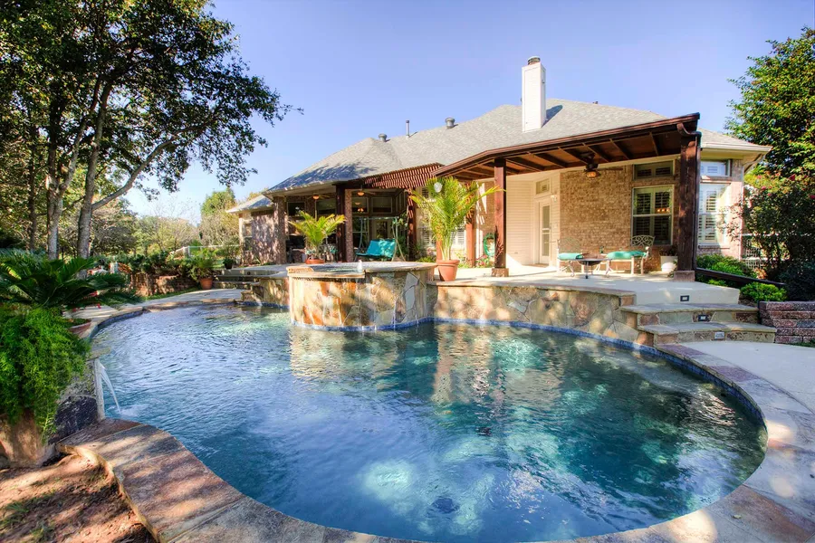 Built in 2001, the homes single-story design offers over 3,300 square feet of interior living space with an open layout, spacious room sizes, higher ceilings, updated flooring and interior colors. There are two living and dining areas including formals and a sizable family room with a wood-burning fireplace with gas logs. The attractive kitchen, which is plumbed for gas, includes beautiful granite countertops, a center island, double ovens, a walk-in pantry, breakfast bar and a butler's pantry. There are 3 bedrooms, each oversized and tucked away in their own separate wing for privacy, a "flex-room" that can be a 4th bedroom, exercise area or home office, 3 full baths and a 3-car garage with 8ft overhead doors to accommodate SUVs. The home also offers many energy saving benefits such as 2x6 construction, a radiant barrier and an irrigation well tied into the yards sprinkler system. Off the back of the home is a large covered patio overlooking a private backyard with a beautiful inground pool with spa and water feature.