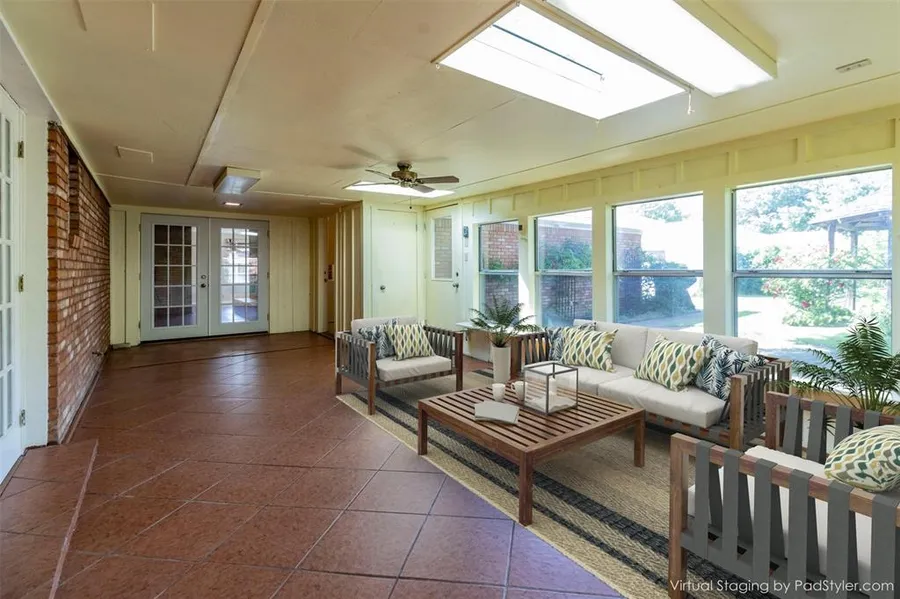 If you're looking for a place to stretch out and relax, this is it. Two living & dining areas; formal living & dining are connected. Updated appliances & cabinet fronts in kitchen; sunny breakfast room; family room with fireplace & built-ins; skylights; spacious primary BR w 3 closets; primary bath with walk-in shower and a wall of storage! Secondary BRs share jack-n-jill bath. Welcoming sun room spans the rear of the house, and primary BR has its own doorway to sun room. Shady landscaped back yard with gazebo and greenhouse. Full sprinkler. Windows replaced 2008; roof 2014; AC 2015, HWH 2018. A big plus is the RV carport, auto carport, and large workshop with electric in back. RV carport is 33Dx12Wx12H; 3rd car carport, storage bay, and workshop w electric are each 25Dx12Wx8H. Industrial roofing installed on sunroom & detached garage in 2013. Storage bay could easily be re-configured for larger workshop space or other needs. Great neighborhood, too! Don't miss it.