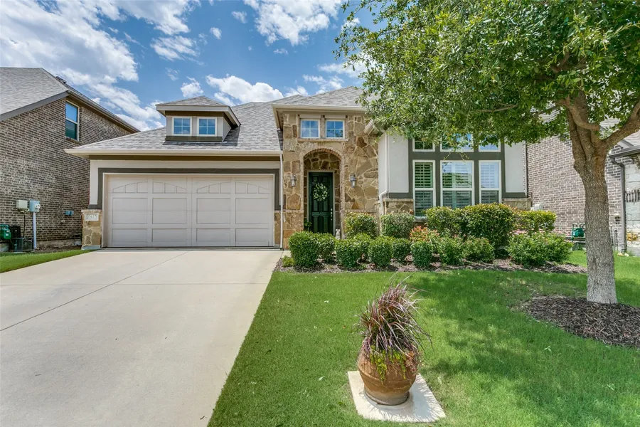 Argyle ISD in Canyon Falls, Flower Mound! A versatile floor plan, great spot in neighborhood and private backyard. Open concept with all beds down and 3 living areas. Tall ceilings, light and bright with Plantation Shutters. Lovely primary suite with split beds across the house and a full bath off spacious entry. Roomy living area with corner fireplace open to kitchen for great gathering space. Adjacent den with French doors used now as a home office. This room may also flex as a formal dining room or playroom. Beautiful spacious kitchen with gas cooktop and on trend finishes. Seating for 4 at counter and a prep island. Large dining area opens to 23' by 9' covered patio. Upstairs is a big game room with walk-in closet and full bath. EASY WALK TO ELEMENTARY, high school and amenities! HOA pays front yard mowing, clubhouse, pools, fitness center, dog park, playground and some FIOS services...