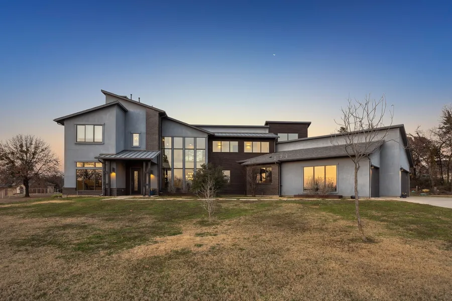 Spanning over 2 acres of land and surrounded by serene nature, this contemporary masterpiece is the ultimate expression of modern luxury living. Clean lines, soaring high ceilings, and walls of windows that blur the line between indoors and outdoors, filling the space with natural light, greet you as you step inside. Boasting over 3,700 sq ft of thoughtfully curated design, the home offers 4 bedrooms with ensuite baths and spacious closets, including primary suites on each level-ensuring the utmost comfort, privacy, and an ideal setup for multi-generational living. If needed, the downstairs office can easily serve as a fifth bedroom, complete with a spacious closet. The chef in your family will adore the gourmet kitchen, equipped with everything a culinary expert could desire, including a gas cooktop, double ovens, dual sinks, open shelving, ample counter, cabinet, and drawer space, and a huge pantry. Stunning architectural details and designer finishes delight you at every turn, from a striking floating staircase to a stained glass insert on the front door, statement light fixtures, and exquisite tile selections. Don't miss the oversized three-car garage, offering plenty of space for all your vehicles and toys, along with a spacious mudroom with built-ins. The dreamy private outdoors include a large covered patio with a built-in grill and fireplace, a sparkling pool, and ample space to explore your hobbies-whether it's gardening, having horses (one per acre allowed), raising chickens, building a workshop, or simply enjoying the privacy, providing a safe haven for kids and pets to roam freely. In addition, enjoy the benefit of low property taxes at just 1.4% and the freedom of no pesky HOA-all while being just minutes from major thoroughfares offering access to countless shops, restaurants, and top-rated Aubrey schools.