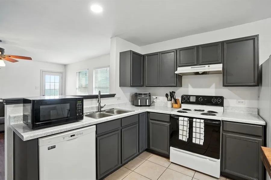 This 4-bedroom, 2-bath home offers a spacious and functional layout perfect for everyday living. The open living and dining areas flow into the kitchen, which features epoxy-coated countertops, dark-painted cabinets for a modern touch, and a large standalone island that adds extra prep space and casual seating options. A bright dining area sits just off the kitchen, ideal for family meals or entertaining.