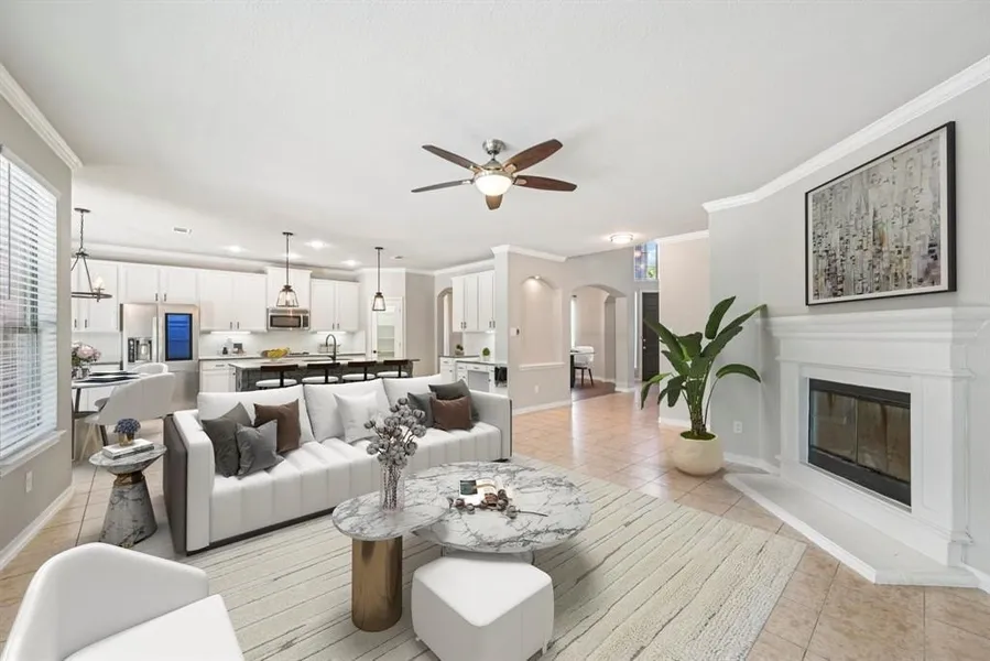 Inside, a spacious home office greets you at the front, flowing seamlessly into a formal dining room, thoughtful half bath, and a convenient walk-in laundry. The living room, open to the kitchen and breakfast nook, invites conversation and comfort with a cozy fireplace. The kitchen impresses with an island, pantry with glass door, breakfast bar, and recessed lighting.