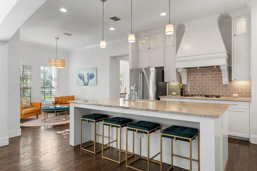 Set on a spacious corner lot with sweeping views of tranquil Texas farmland, this beautifully crafted 4-bedroom, 4 bath home blends charm, comfort, and timeless elegance. Unwind each evening with stunning Texas sunsets right from your backyard,a peaceful retreat from the everyday. Inside, you'll find an open-concept layout accented by detailed wainscoting, custom chadeliers, and rich hand-scraped hardwood floors that extend through the main living areas. The light-filled kitchen is the heart of the home, featuring an oversized island, stainless steel applicanes, abundant cabinetry, walk-in pantry and a seamless flow into the living room, perfect for entertaining or relaxing nights in. A wall of windows bathes the space in natural light, while a charming breakfast nook, which could also be styled as a cozy sitting and reading area or lounge, invites you to slow down and savor the moment. ...