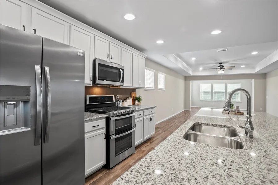 MOTIVATED SELLER! Welcome to your dream home in Del Webb at Union Park, a 55+ community. This Garden Series STEEL CREEK floorplan with Sun Room offers a luxurious two-bedroom, two-bathroom layout with an open floor plan, ample natural light, & expansive windows framing the picturesque landscape. Kitchen boasts granite countertops, white cabinets with hardware, custom pull-out drawers, & gas cooktop double oven. Primary bedroom with its spacious design, spa-like bathroom boasting dual sinks, & walk-in closet. The second bedroom provides versatility as a study or guest room. Wood-look tile flows through the main areas, complemented by a charming barn door leading to the Master Bathroom. Outside, enjoy the fenced yard & covered outdoor living area, perfect for tranquil moments. With a two-car garage & an array of amenities including tennis, pickleball, pool, & more, indulge in the ideal low-maintenance lifestyle. Del Webb is a premium 55+ community.