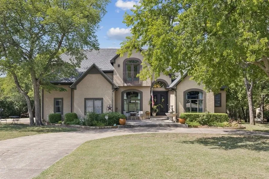 Brilliantly remodeled 4-bed, 3.5-bath house on a scenic 1-acre lot in Sunrise Bay - a lakefront community of all custom homes on Lewisville Lake. Only a 2-minute walk along the creek on the property to the lake! Large circle and side driveways accommodate up to 12 cars and a boat! You'll be impressed by the textured stucco facade and spacious front porch. Dark engineered hardwood floors greet you as you enter. With numerous welcoming living areas, you'll have plenty of room to host friends and family. Across from the formal dining room is the private office with built-in shelving. The home has 2 wood-burning fireplaces. The remodeled eat-in kitchen has sleek granite counters, shaker cabinets, stainless steel appliances, and updated fixtures. Custom glass-front cabinets with built-in lighting and the breakfast room's bay window add character to the space. The private primary suite has a remodeled ensuite bathroom with a standalone tub, frameless walk-in tile shower, dual quartz vanities, and walk-in closets. Secondary full baths have been updated with high-end finishes. Rich wood stairs with stylish treads lead to a flexible living space upstairs. Take in the expansive lot from the back deck. The detached storage shed features roll-up doors and electricity. Enjoy the peace of mind of purchasing a home where foundation work was completed this summer and has a lifetime transferable warranty, plus a Class IV roof installed at the end of 2024! Keep energy bills down thanks to the double-hung Pella windows. The entire downstairs is pre-wired for audio with in-ceiling speakers, and the home generator will ensure you're never without electricity. The house is 2 miles away from the Little Elm Beach with 3 lane boat ramp, and only a couple more miles away from the Marina, as well as the PGA of America Headquarters and golf courses at Fields Ranch. The Sunrise Bay subdivision is walkable with multiple parks, hiking trails, and a stocked fishing pond for tons of outdoor fun!