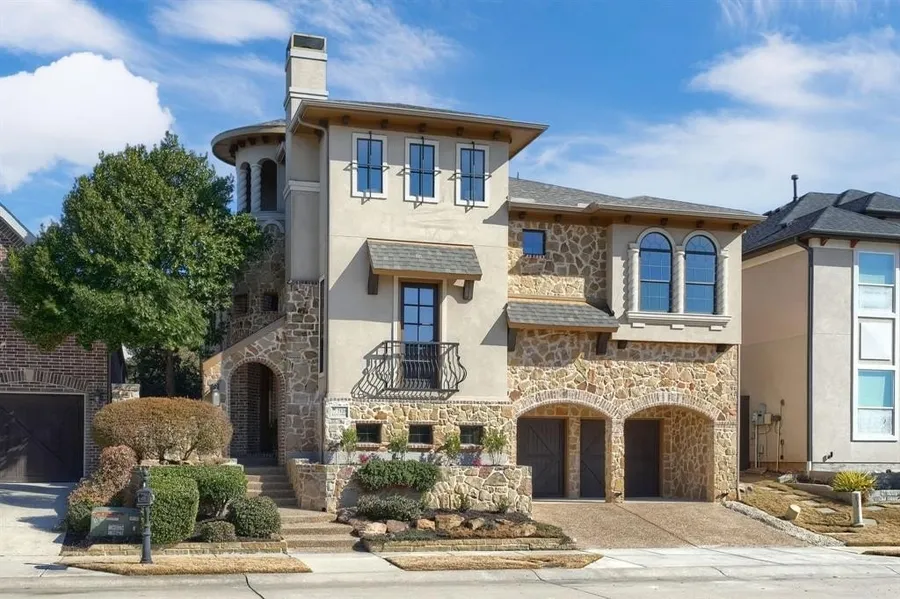 This custom built Sotheby residence has just completed a comprehensive renovation, thoughtfully transforming the home into a refined modern Mediterranean style. The renovation is anchored by new Taj Mahal quartzite countertops throughout and extensive designer lighting upgrades across the entire home, creating a cohesive, elevated aesthetic. Taj Mahal quartzite is featured in the kitchen, office, all bathrooms, and bar areas, offering rare material continuity and a high end finish throughout. The kitchen and primary bathroom are standout spaces, beautifully updated and designed for both everyday living and entertaining. Newly replaced backsplashes in the kitchen, wine grotto, and upstairs bar further enhance the home’s modern appeal. Upgraded lighting, including statement pendants and ceiling fans, adds architectural character and warmth throughout. Handscraped real hardwood floors flow through the main living areas, while new carpet has been installed in the upstairs bedrooms, office, and wine cellar or grotto. All plumbing fixtures, bathroom hardware, and door hardware have been replaced with contemporary black finishes. The home offers exceptional functionality with a private office featuring a gas log fireplace and custom real wood built ins, a wine cellar or grotto with its own fireplace, a dedicated media room, second floor wet bar and pool room, and an extra large upstairs bedroom ideal for flexible use. Recent improvements include roof replacement, refreshed landscaping, a courtyard fountain, and a three car garage with epoxy flooring. Enjoy peaceful nighttime surroundings with no traffic noise and views of the neighborhood lake and fountain. Ideally located minutes from Grandscape and Legacy West, with easy access to SH-121 and the Dallas North Tollway, offering approximately 20-minute access to Love Field or DFW Airport. Professionally staged and truly turnkey.
