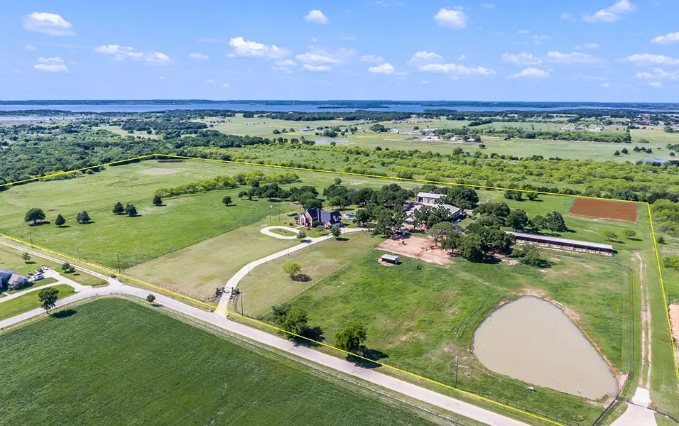 This Scenic 50-Acre Equestrian Estate is near Lake Ray Roberts in Pilot Point and offers a gracious 5 Bedroom Home with Pool, a First-Class Show Barn, Shed-Row Style Barn, a Large RV/Equipment Storage Building with 2 Apartments and gorgeous sandy loam acreage enhanced with pretty oak trees and rolling fenced pastures.