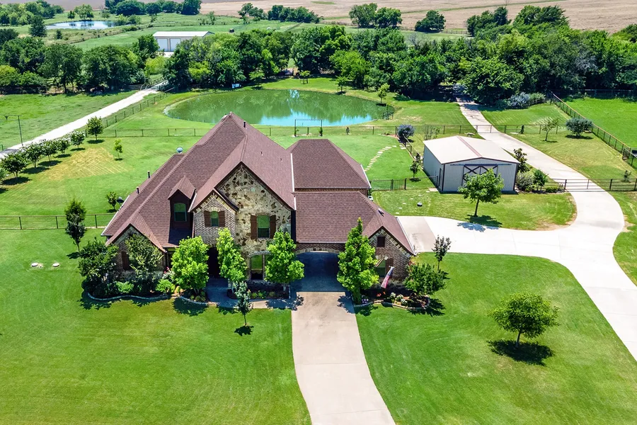 This immaculate ranchette on 4.85 acres sits in a desirable acreage neighborhood and features a beautifully maintained custom home, barn, large pet-friendly fenced backyard, pond with fish, wooded creek, and fenced pastures.